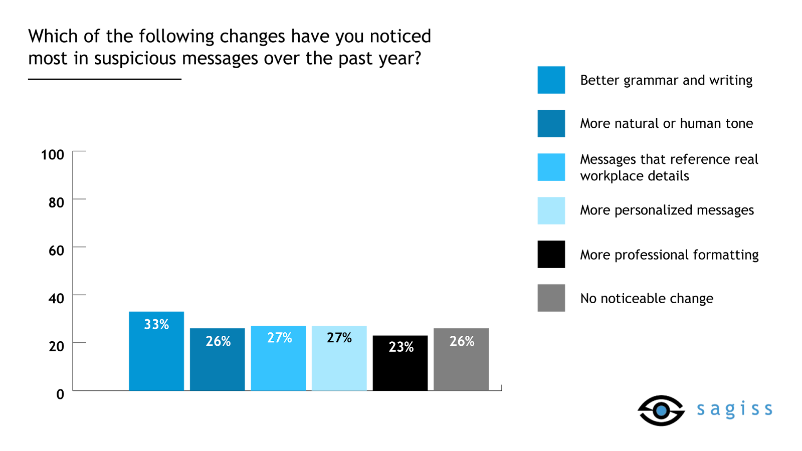 33% say they have noticed better grammar and writing in suspicious messages over the past year.