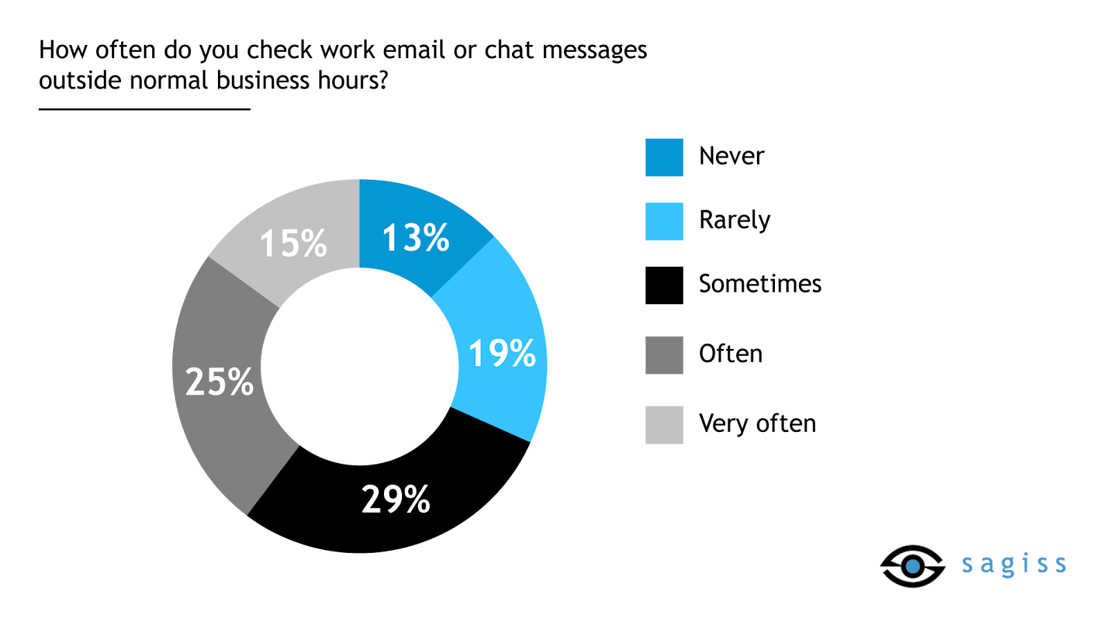 - 68% check work email or chat outside normal business hours at least sometimes, and 56% feel pressure to respond after hours at least sometimes.