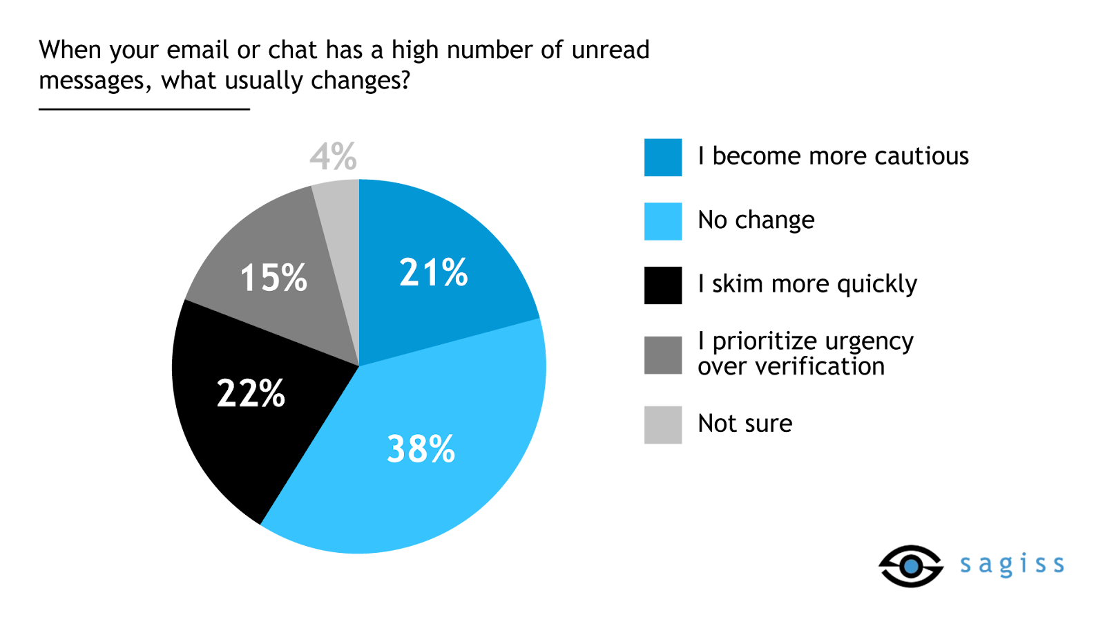 Inbox overload appears to make that problem worse. When email or chat has a high number of unread messages, 22% say they skim more quickly, and 15% say they prioritize urgency over verification. Even among workers trying to keep up, the pressure to move faster can weaken the pause that phishing defense depends on.