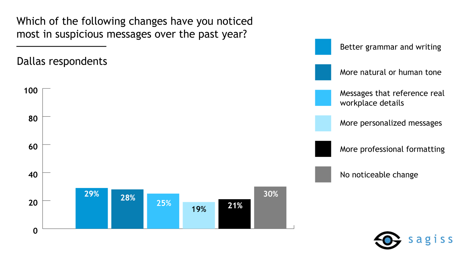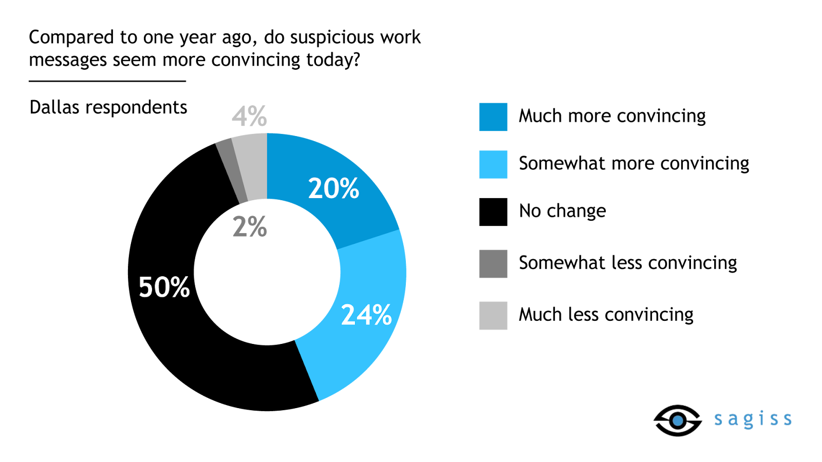 50% of Dallas respondents say suspicious work messages seem no more convincing today than a year ago.