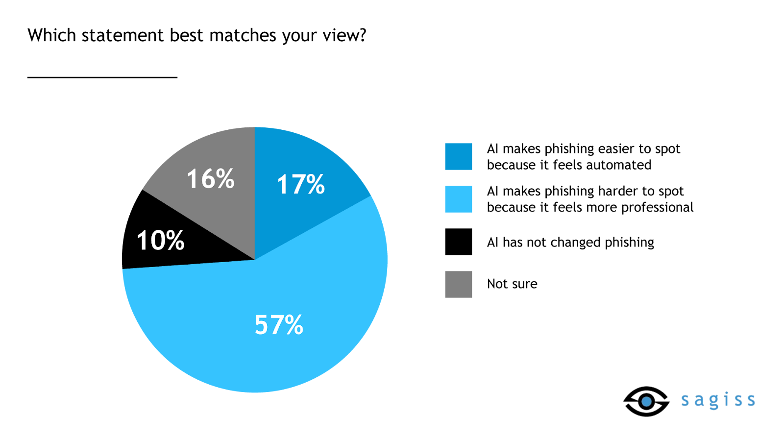 - 64% say an AI-generated message could likely impersonate someone they work with, and 57% say AI makes phishing harder to spot because it feels more professional.