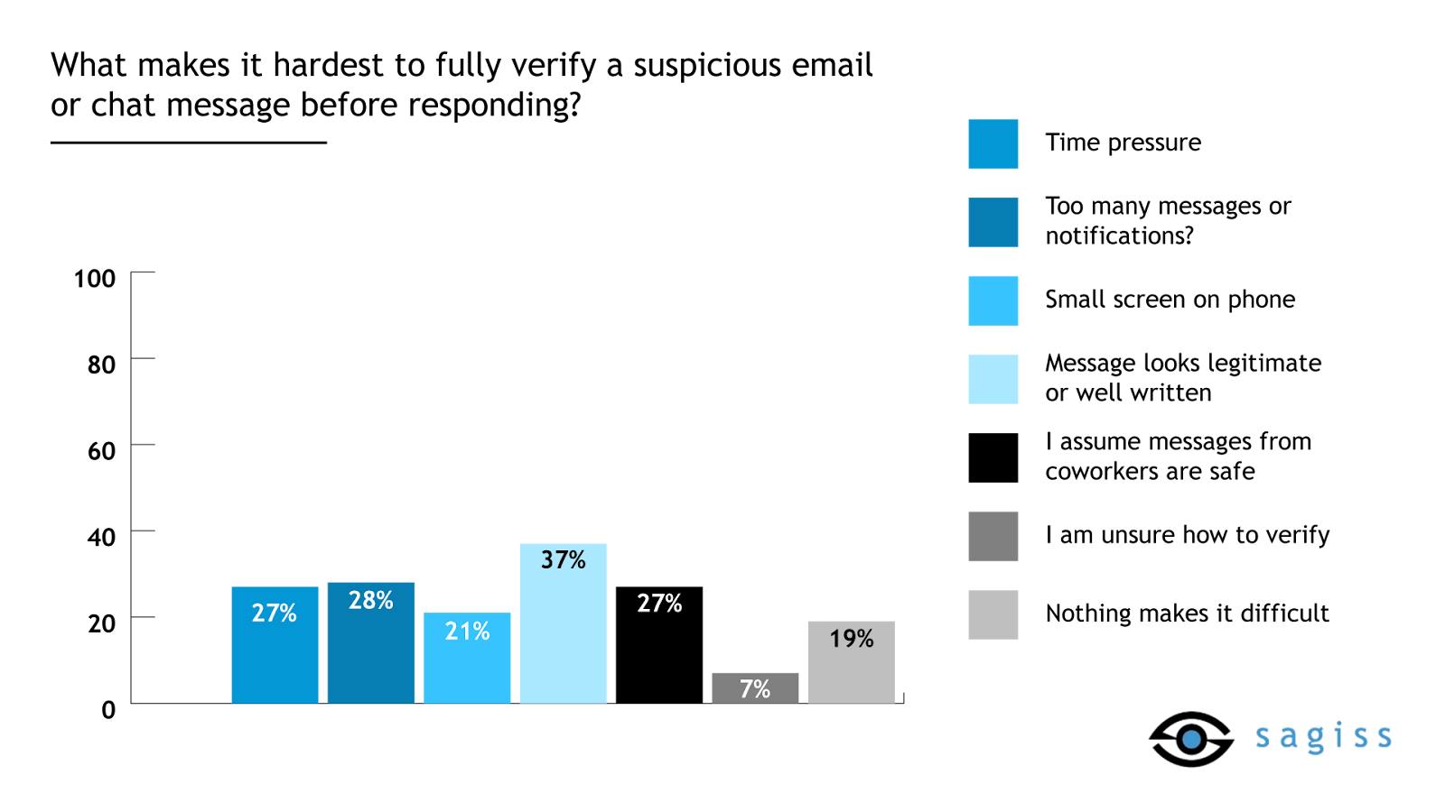 When respondents were asked what makes suspicious messages hardest to verify before responding, the top answer was that the message looks legitimate or well written at 37%. After that came too many messages or notifications at 28% and time pressure at 27%. Only 7% say the problem is that they are unsure how to verify a message. That distinction matters. The problem is less about basic knowledge and more about conditions that make caution harder to practice consistently.