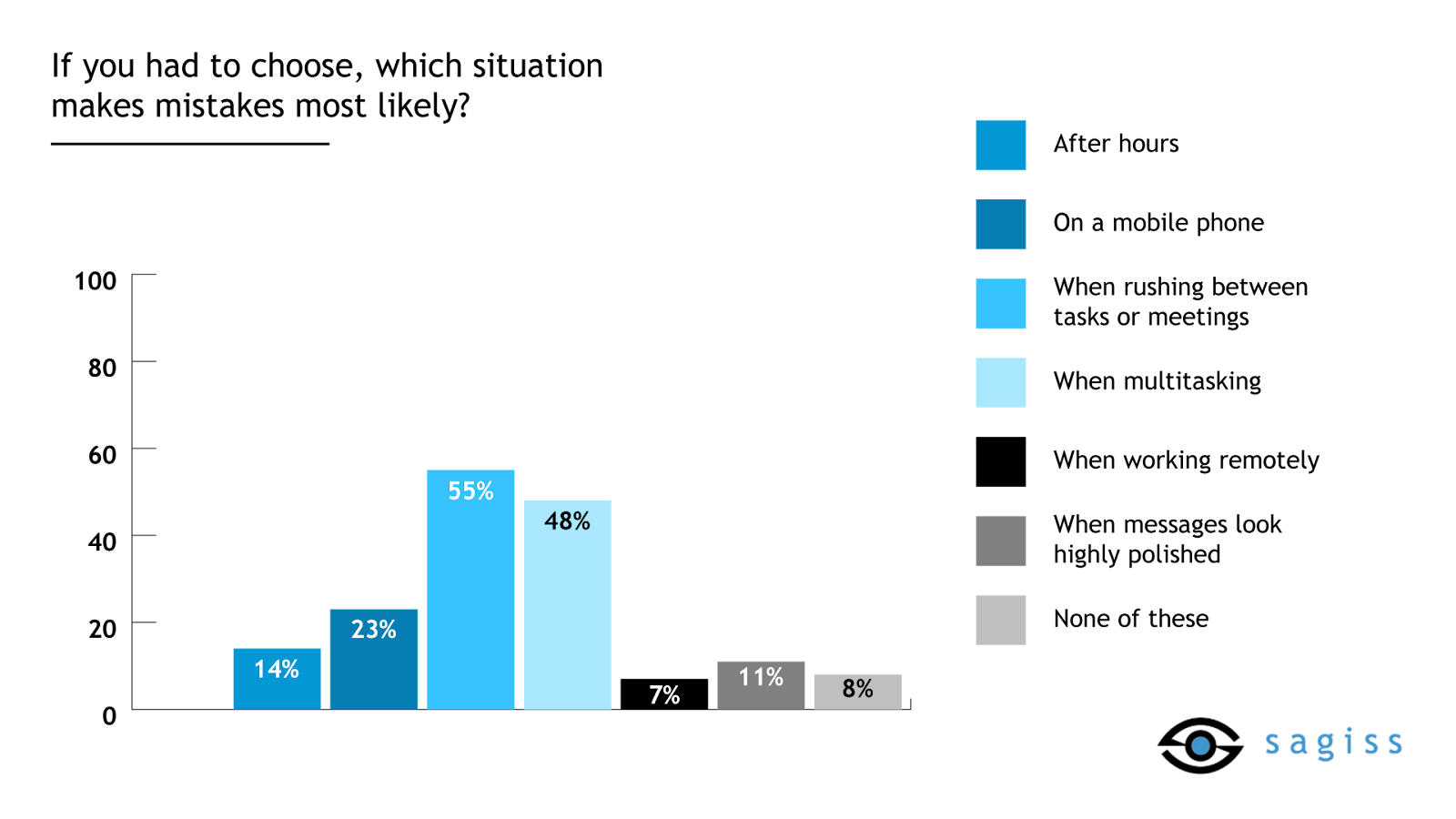 The survey points to a practical explanation for why these behaviors persist. People are often making decisions in conditions that favor fast action over careful review. Asked which situations make mistakes most likely, 55% point to rushing between tasks or meetings, while 48% point to multitasking. These are not fringe scenarios. They are normal features of many workdays.